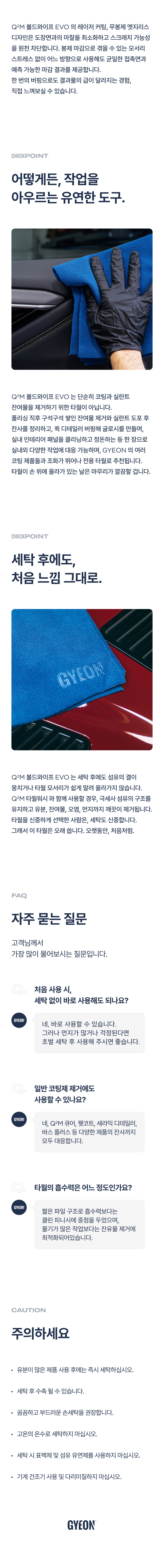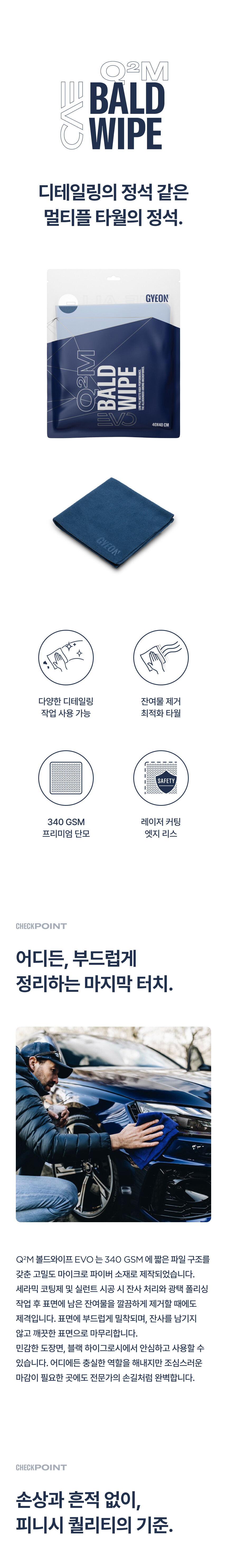 Q²M 볼드와이프 EVO 는 양면 모두 단모로 제작되어 표면 관리 및 버핑, 코팅, 클리닝 등 활용도가 높아 모든 디테일링에 사용할 수 있는 깔끔한 사용감이 돋보이는 프리미엄 다용도 마이크로파이버 타월입니다.